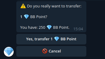 Set Secret (any words or symbols - whatever you want) in @BBPointBot by command: /setTransferSecret